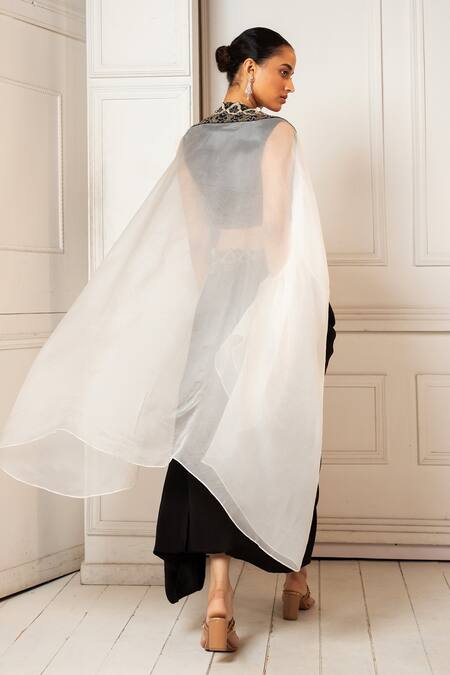 Black embroidered blouse featuring cutwork neckline and drop shoulder sleeves. Paired with an ivory silk organza cape and a solid draped skirt.