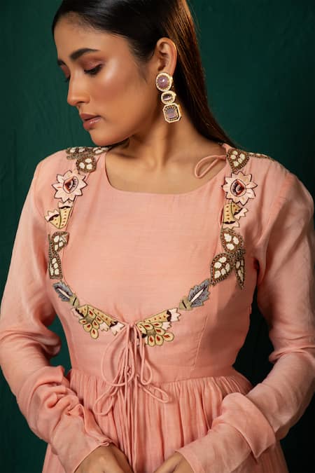 Pink chanderi anarkali featuring floral thread and pearl embroidery with a tie-up detail. Paired with a coordinating silk organza dupatta and solid pant.