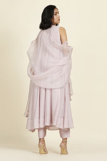 Purple Chanderi anarkali featuring chid and sequin embroidery on the neckline. Accompanied by a silk pant and a silk organza dupatta with scallop borders.