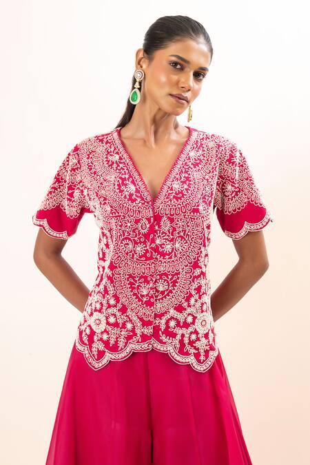 Fuchsia jacket featuring scalloped cut work hem and vintage pattern with contrast chidd & pearl hand embroidery. Paired with an asymmetric flared sharara for a complete look.