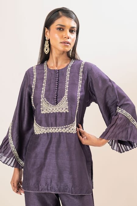 Purple kurta featuring floral embroidery with pleated cuffs and round neckline. Paired with matching pants adorned with floral embroidered lace.