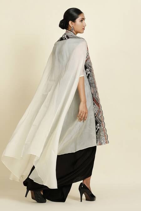 Black matte satin draped skirt featuring pleats at the back. Paired with an off white cape with embroidered border and a round neck top adorned with zardozi, metal, cotton thread, and sequin hand embroidery.