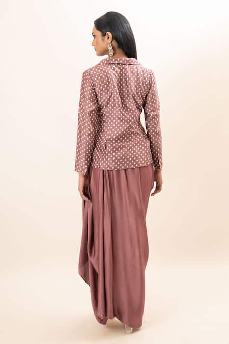 Dusty pink blazer featuring a floral print and a front tie-up. Paired with a draped skirt in a satin finish.