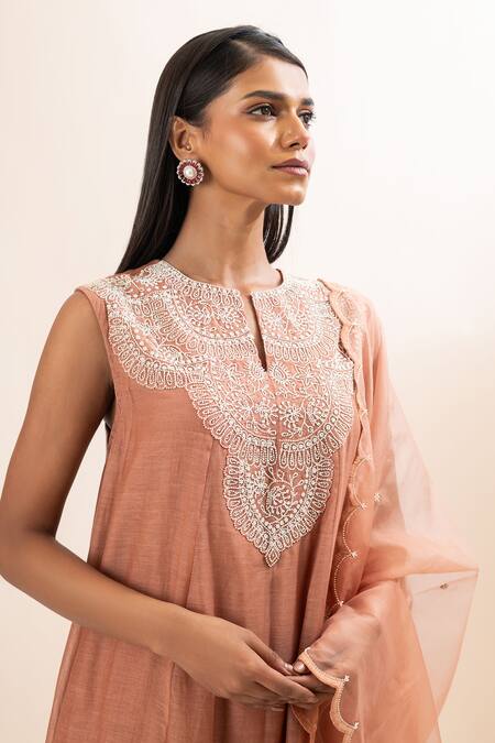 Dust pink chanderi anarkali featuring a notched round neck with vintage pattern and contrast chidd & pearl hand embroidered yoke. Paired with a scalloped cut work bordered organza dupatta and broad bamber silk pant.