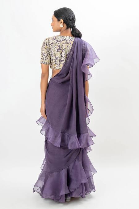 Purple pre-draped ruffle saree made from chiffon & silk organza featuring floral hand embroidery. Paired with a padded blouse in bamber silk adorned with sequins and beads, showcasing a round neckline and half sleeves.