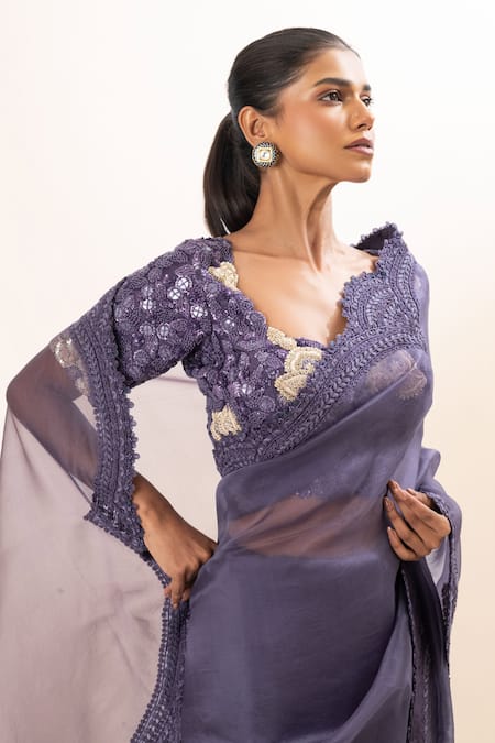 Purple saree made from silk organza featuring a laser cutwork scallop border. Accompanied by a padded blouse crafted in bamber silk with floral hand embroidery and sequins embellishments.