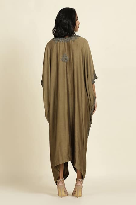 Olive green silk chanderi kaftan featuring tonal chid hand embroidered borders and panels