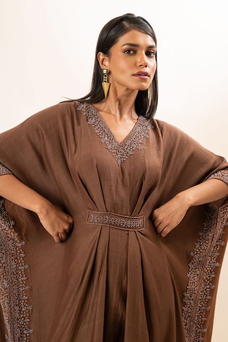 Brown Silk, Chanderi, Taffeta Embroidery V-neck Kaftan