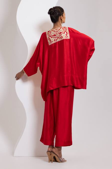 A red silk phiran featuring a V-neckline and hand-embroidered yoke with light gold zardosi work. Paired with coordinating red silk broad pants with an elastic closure.