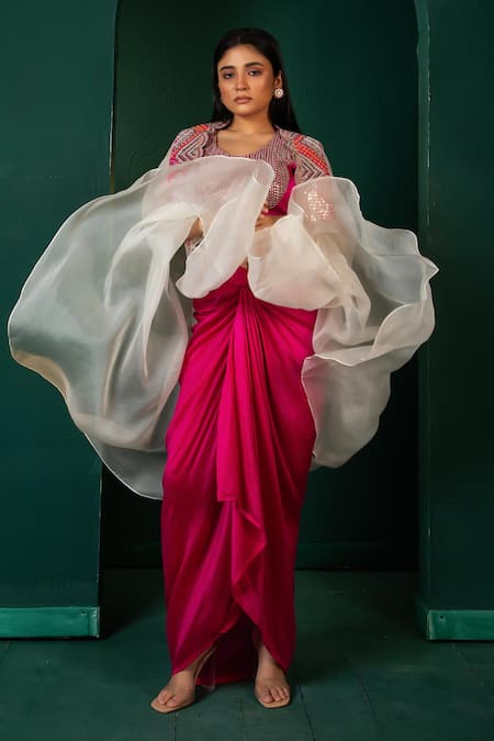 Fuchsia pink blouse featuring round neckline with sequins and zardosi embroidery. Paired with an ivory silk organza cape and solid draped skirt.