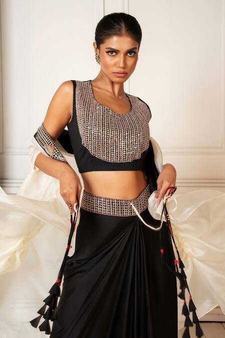 Black draped skirt paired with a black embroidered blouse and ivory silk organza cape. The cape features zardosi and sequins embroidered scallop border with drawstring detailing.