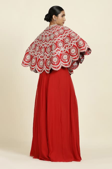 Red cape featuring zardozi embroidery with metal dori and cord work. Paired with a high waist chiffon sharara with a zip closure.