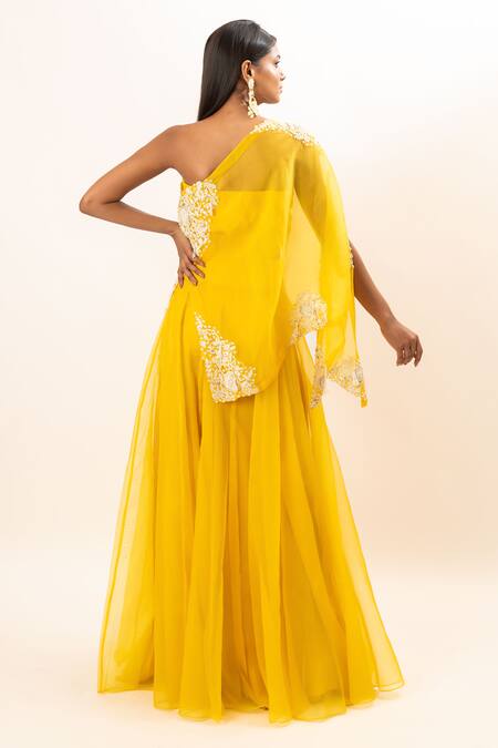Yellow cape featuring a one shoulder neckline and floral hand embroidery with zardozi, crystals, and French knots. Paired with a pleated lehenga and inner tube top, both crafted from organza and cotton lycra.