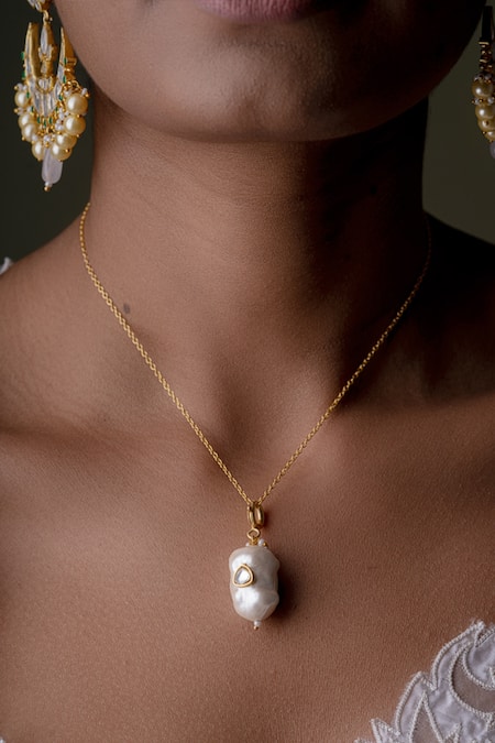 Gold pendant necklace featuring a baraque pearl pendant with semi precious polki embellishment