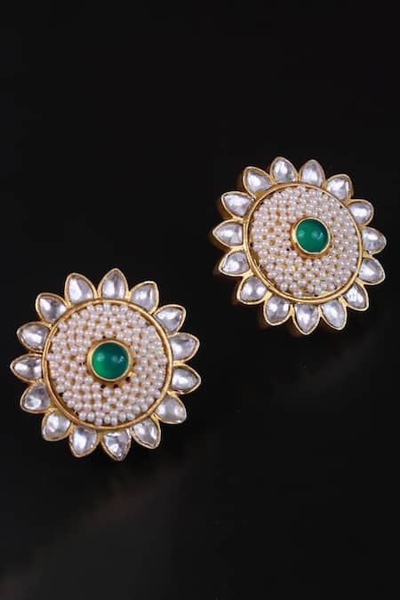 Gold floral shape studs featuring polki and green stone embellishments with pearl details