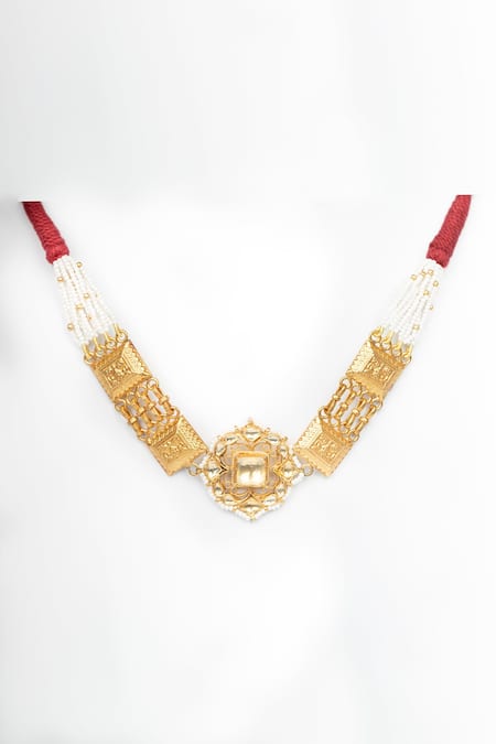 Gold choker featuring semi-precious polki and geometric motifs with cutwork detailing