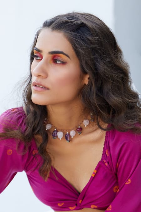 Gold necklace featuring semi precious polki, fluorite, rose quartz, and amethyst gemstone drops