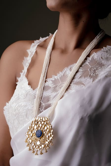 Gold long pendant necklace featuring a polki embellished pendant with a textured blue stone in the center
