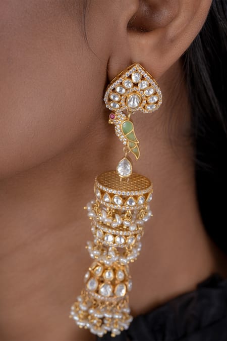 Polki embellishments with pearl drops, Parrot detail in the center, Handcrafted design