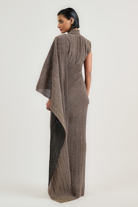 Pleated detailing for added texture, Stylish asymmetrical drape, Elegant silhouette enhancing features