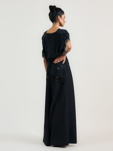 Black Silk, Crepe Beads V-neck Multi-way Fringed Top
