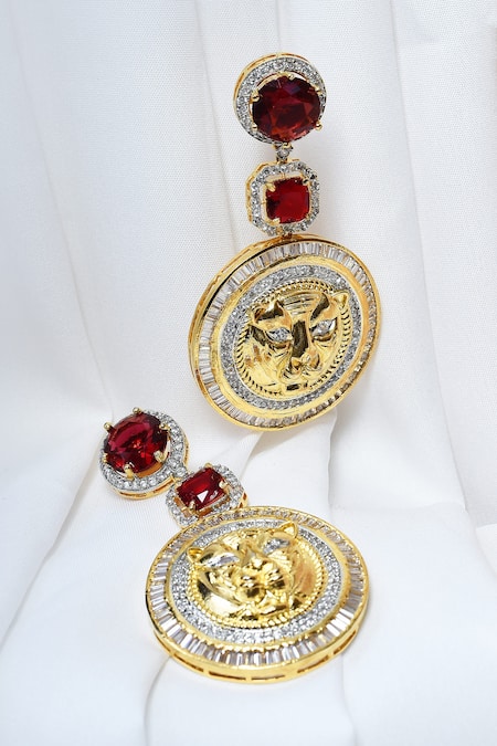 Buy_Our Purple Studio_Gold Plated Diamonds, Stones Carved Lion Pattern Earrings _Online_at_Aza_Fashions