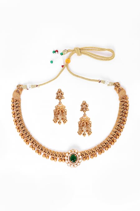 Gold toned carved temple necklace featuring green and white stones. Paired with matching jhumka earrings for a complete look.