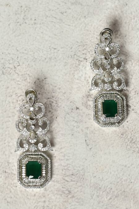 White dangler earrings featuring American diamonds and green semi-precious stones