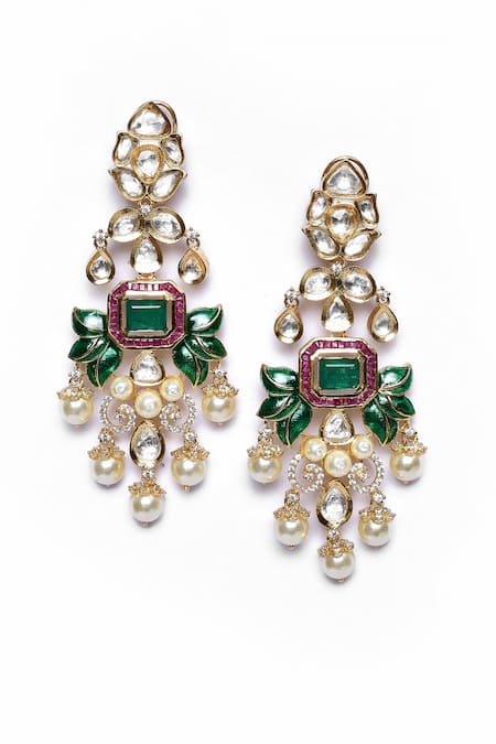Buy_Our Purple Studio_Green Crystals, Pearls French Bloom Petal Stone Embellished Danglers _at_Aza_Fashions