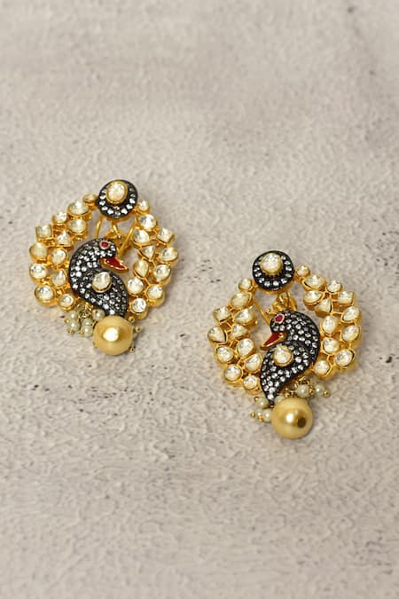 Gold and black peacock motif earrings featuring intricate Kundan embellishments