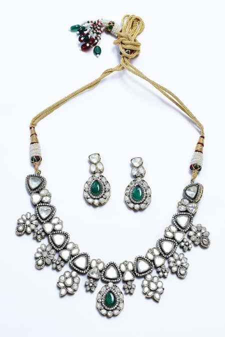 Green necklace featuring silver toned pendant with white kundan stones, polki, pearls, and green semi-precious stones embellishments. Paired with matching earrings adorned with similar embellishments.