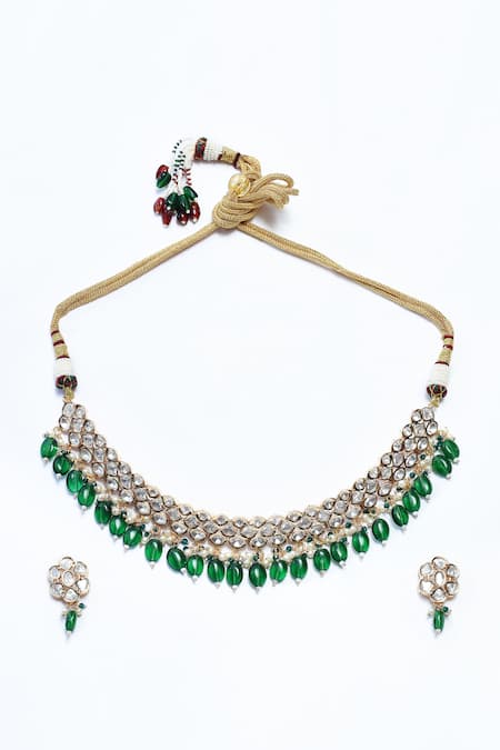 White choker necklace embellished with kundan stones and green semi-precious stones. Paired with matching drop earrings featuring similar stone embellishments.