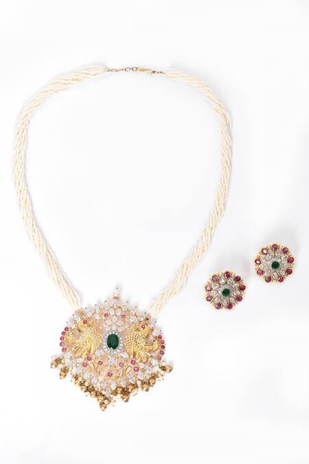 Shop_Our Purple Studio_White Crystals, Beads, Stones Embellished Long Pendant Necklace Set_Online_at_Aza_Fashions