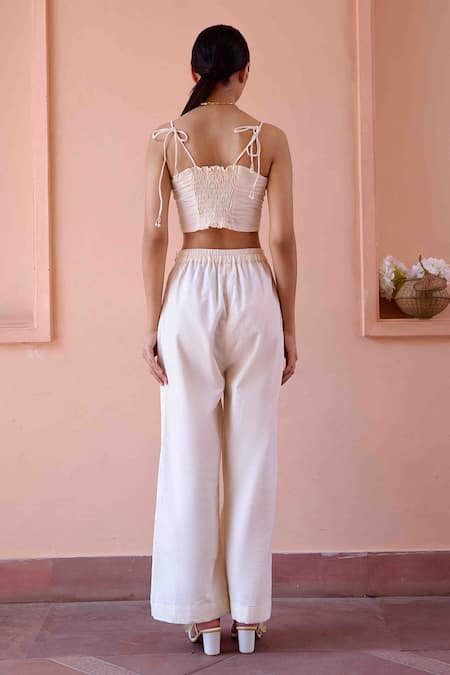 Beige crop top featuring floral applique motifs and a smocked back. Paired with high-waisted pants for a relaxed fit.
