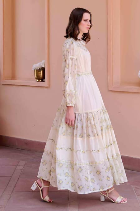 Beige Cotton, Chanderi Embroidery Round Neck Irene Printed Dress