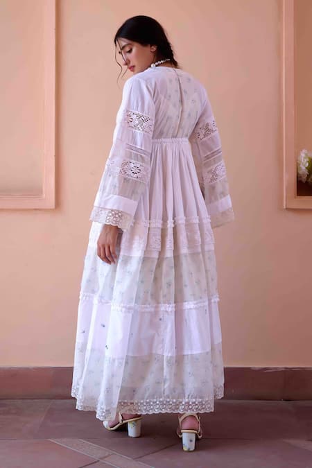 White Cotton, Chanderi Embroidery, Lace V-neck Lucy Panelled Dress