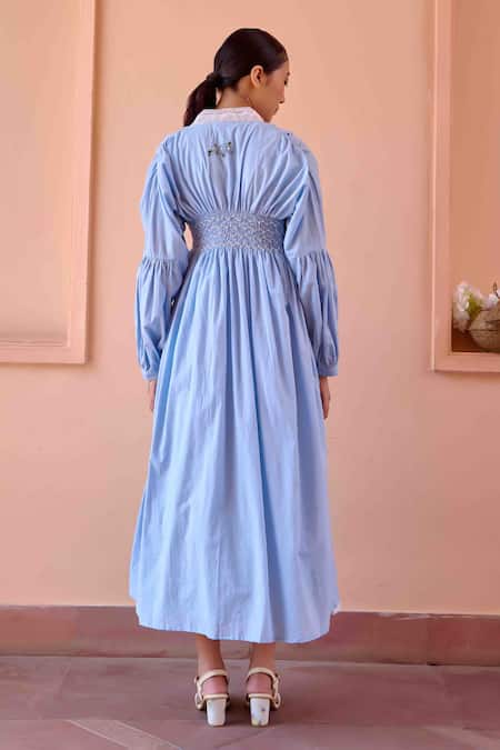 Blue Cotton, Chanderi V-, Open Ruched Jacket With Floral Print Dress