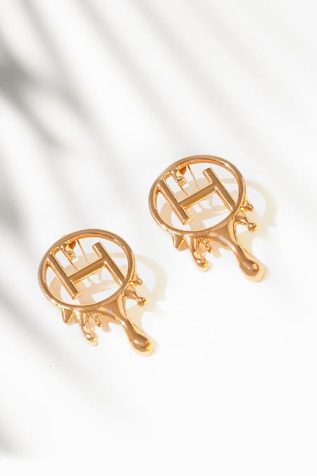 Gold mini earrings featuring 'OH' monogram cutwork shape with a dripping effect. Made from brass and plated in 22kt gold, these earrings are nickel free.