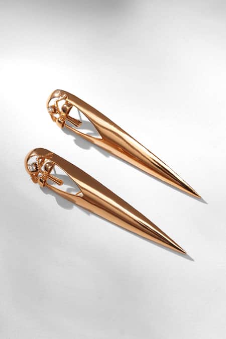 Gold long earrings featuring cubic zirconia embellishments and engraved details