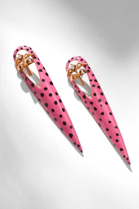 Pink long earrings featuring cubic zirconia embellishments and polka dots