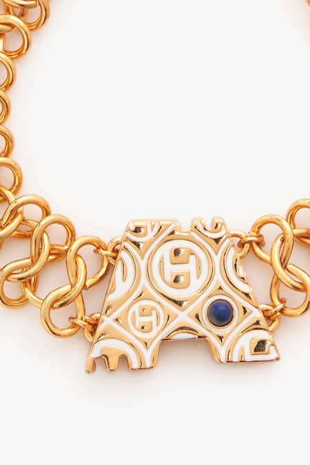 Gold bracelet featuring lapis stone embellishment and enamelled monogram detail