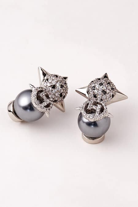 Silver stud earrings featuring a geometric design with spiked details and embellished Swarovski crystals