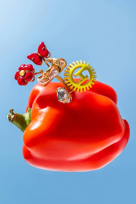 Lacquered oh monogram detail, Colorful poppi cabochon embellishments, Keshi pearl accent