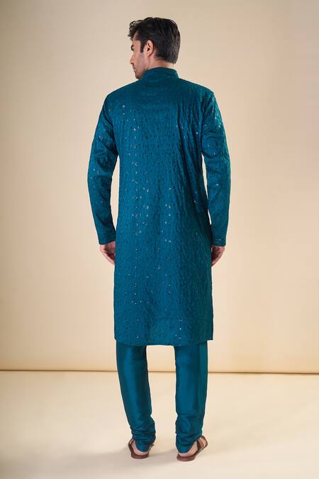 Teal blue silk blend kurta featuring a band collar and full sleeves with geometric sequin and thread embroidery. Paired with a coordinating solid pyjama.