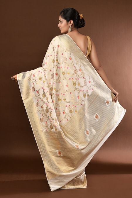 White Flower Banarasi Silk Saree With Running Blouse