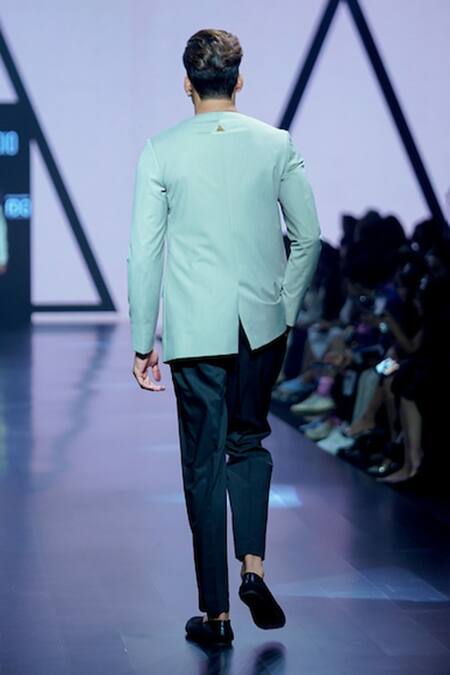 Grey overlap bandhgala featuring front button detailing and flap pocket with black embroidery. Paired with black pant for a complete look.