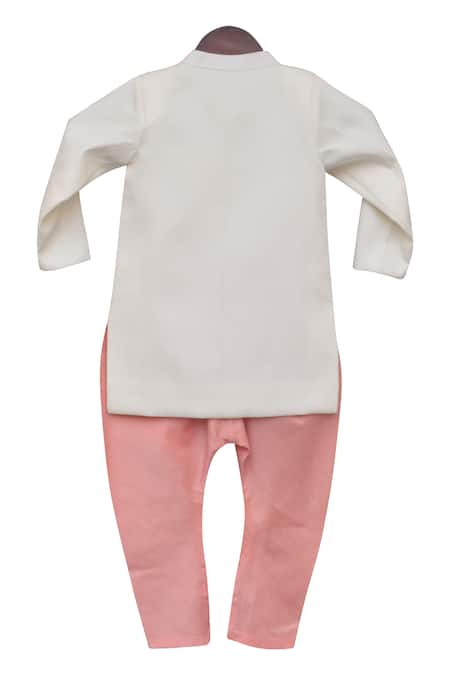 Off white kurta featuring patchwork bead embroidery and a Mandarin collar. Paired with peach elasticated waist pants.