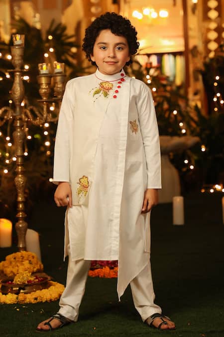 White overlap kurta featuring floral embroidery and sequins highlights. Paired with matching pants in poplin cotton and organza fabric.