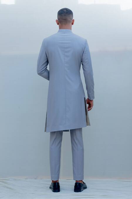Grey sherwani with overlap detail & side button placket. Paired with shirt & pant.