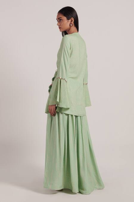 Green rayon flex overlap top embellished with metal sequins and tassels. Comes with gathered sharara.